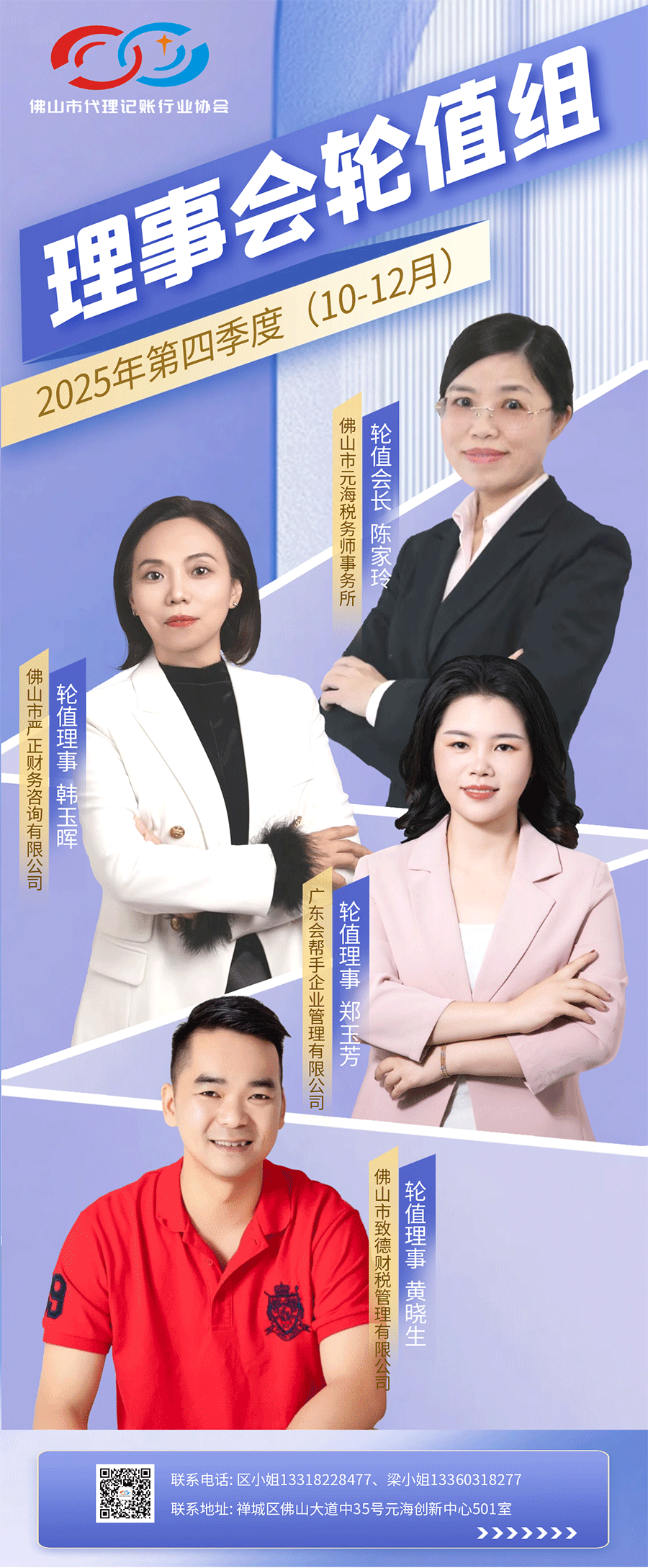 为推动佛山市代理记账行业协会的高质量发展,进一步优化协会的组织架构与运行机制,充分发挥协会领导班子的集体智慧与专业优势,调动会员积极性,确保工作目标落实,自2023年2月起实施的会长轮值制度成效显著。以下是2025年第四季度(10月-12月)理事会轮值组名单及企业介绍: