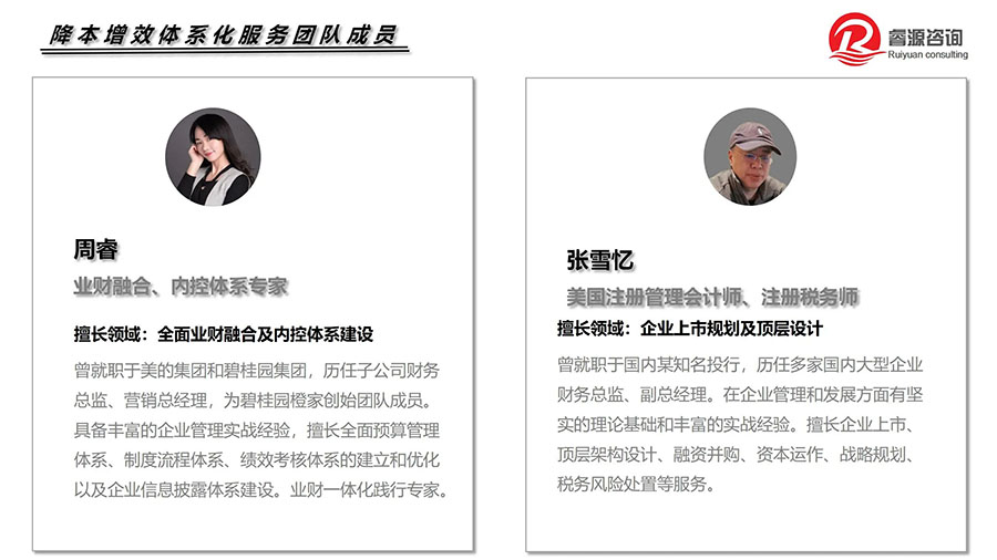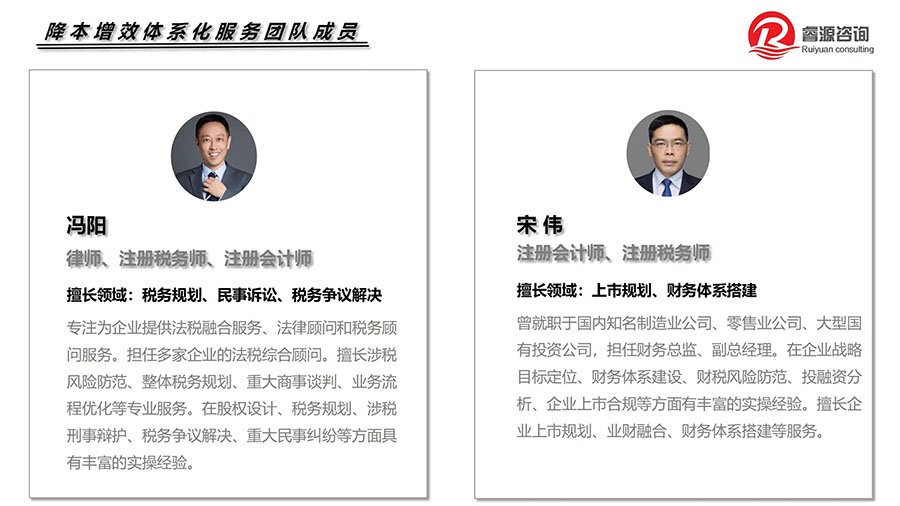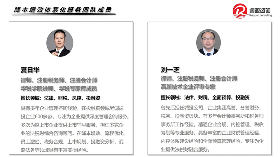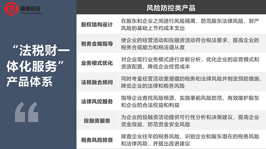 睿源咨询公司以法税财一体化为基础,为企业提供经营提升、风险防控两大类的深度咨询服务。团队成员由律师、税务师、注册会计师、企业高管组成,打破专业壁垒。为客户提供省心高效的综合服务,客户只需对接公司一个团队,即可实现在优化商业模式的同时,提升企业运营效率,在合规经营的基础上全面防控法律、税务、财务方面的风险。