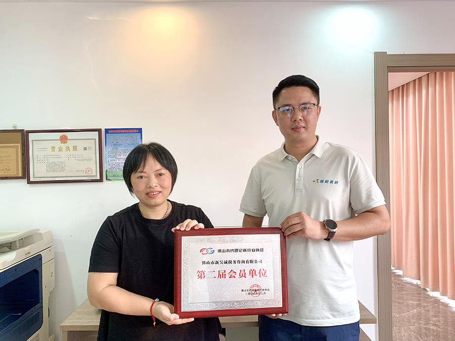协会副会长周总为佛山市新昊诚税务咨询有限公司邓总授予新会员牌匾