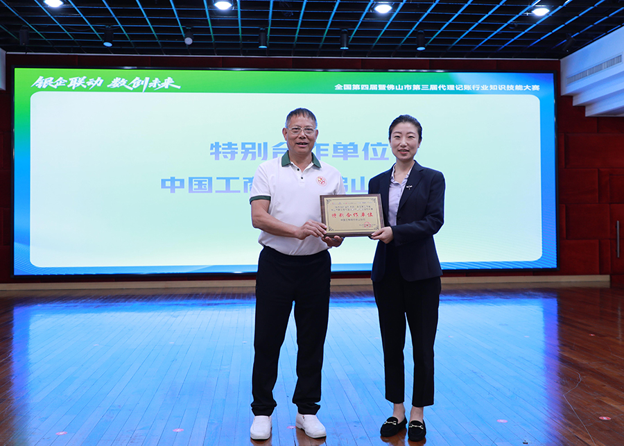 张会长为中国工商银行佛山分行颁发“特别合作单位”牌匾,感谢工行对大赛的全方位支持,以及对佛山代账行业发展的关注与助力。