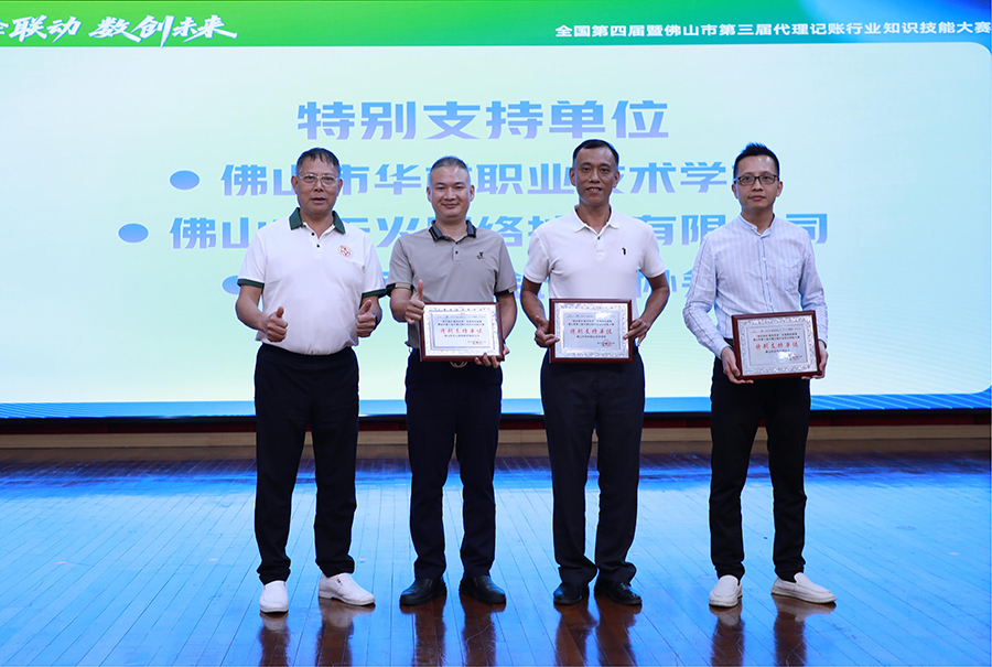 协会会长张广辉为佛山市华材职业技术学校江湾教学点李培江主任、佛山市总会计师协会代表陈荣峰执行会长、佛山市天火网络技术有限公司负责人吕惠杰先生颁发“特别支持单位”牌匾。感谢这三家单位为大赛提供了场地、技术、宣传推广等关键支持,为赛事开展奠定了坚实基础。