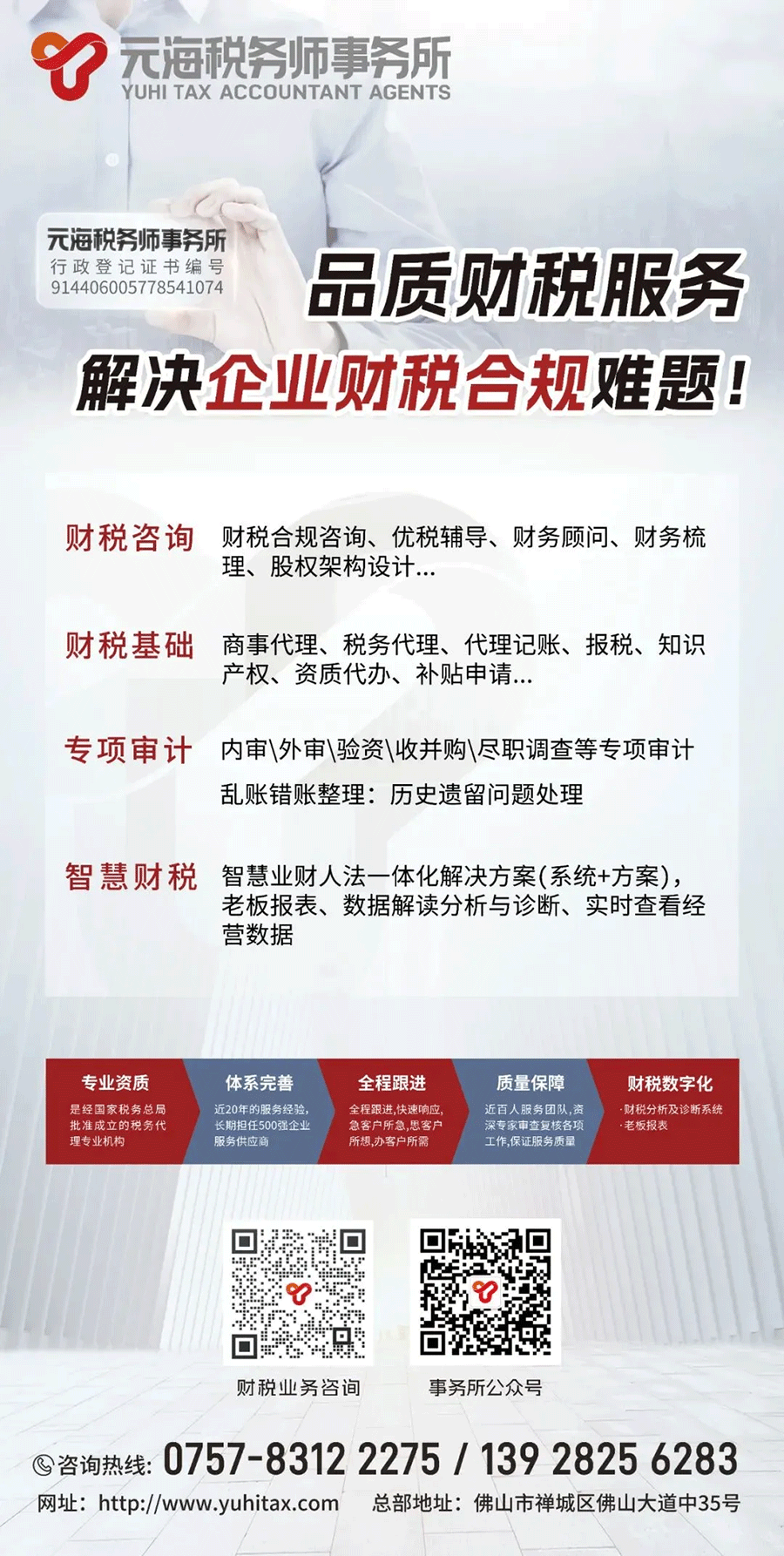 元海税务师事务所(行政登记证书编号914406005778541074)是一家专业从事涉税服务与具备涉税鉴证资质的机构。