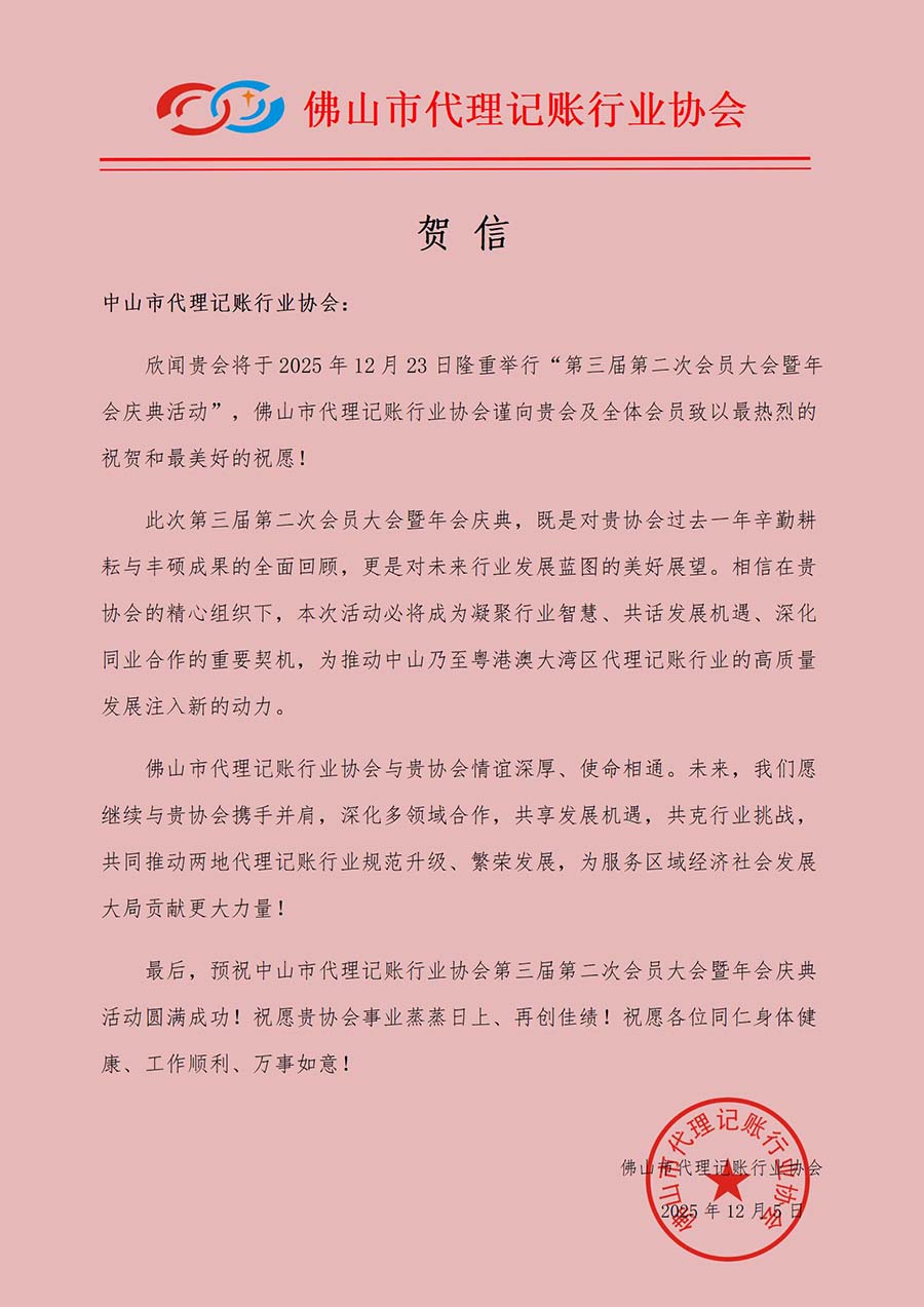 2025年12月23日,中山市代理记账行业协会第三届第二次会员大会暨年会庆典在中山永安新城皇冠假日酒店隆重举行。本次大会以“财赋新程 价值共生”为主题,吸引了超四百位各界嘉宾、友好商协会及会员单位代表齐聚一堂。与会同仁共叙奋斗历程,共绘协同发展新蓝图