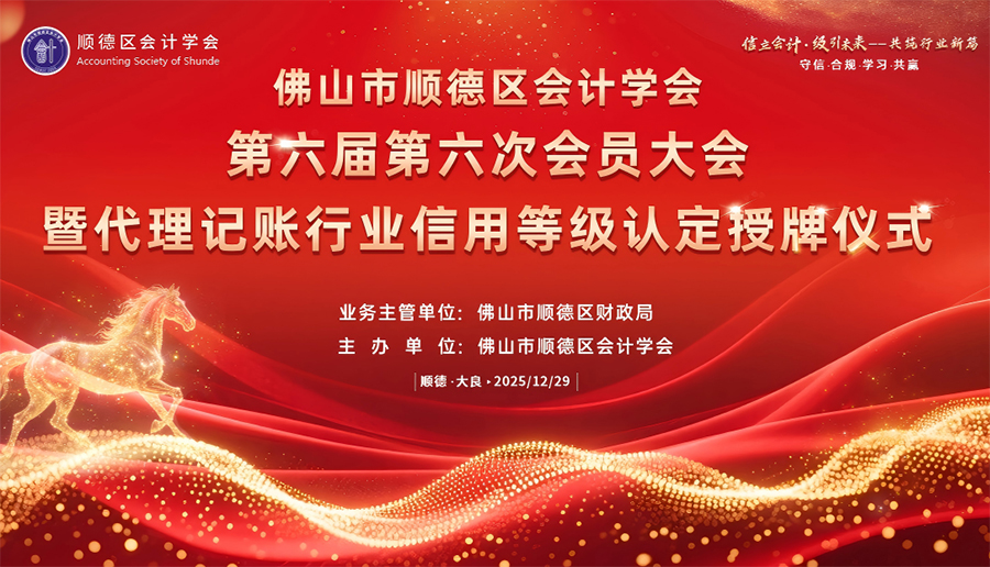 2025年12月29日下午3时30分,佛山市顺德区会计学会第六届第六次会员大会暨代理记账行业信用等级认定授牌仪式在仙泉酒店会议中心隆重举办。