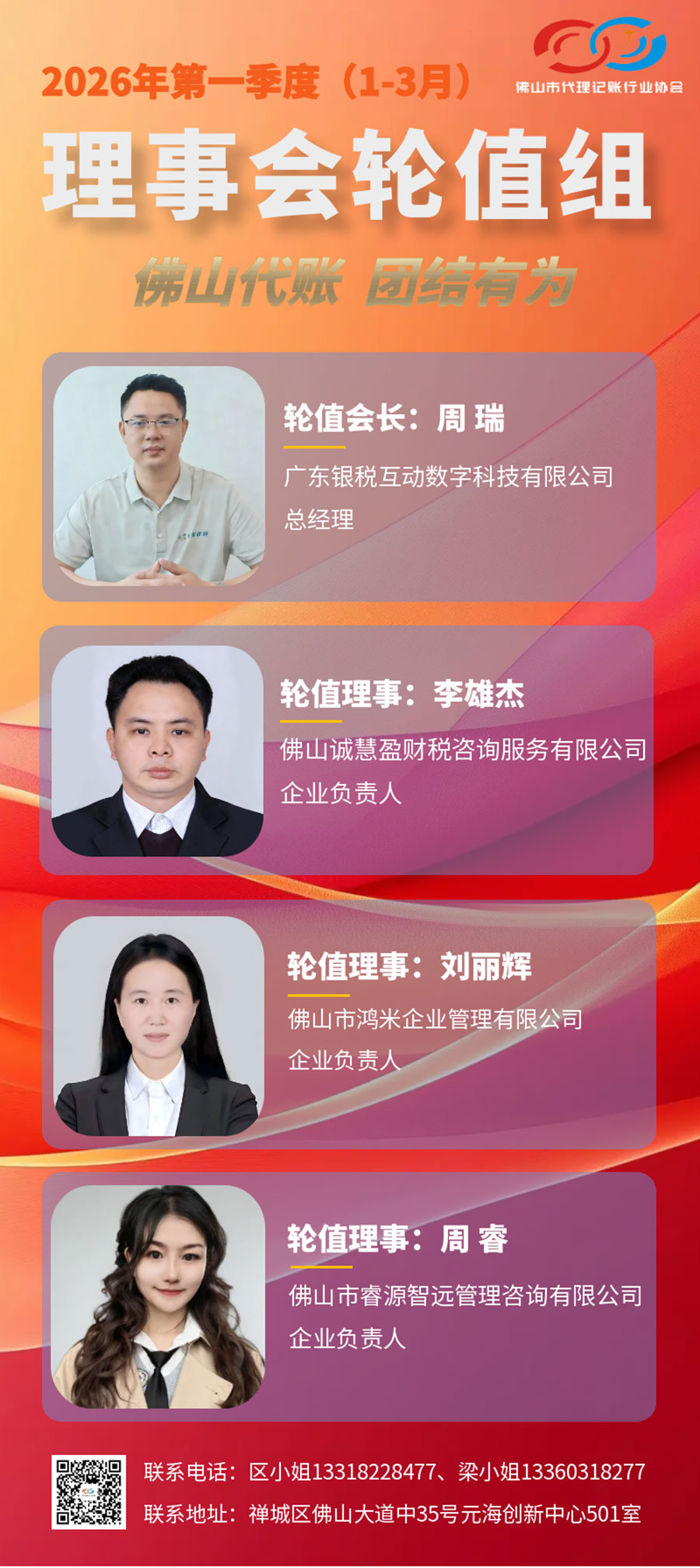 为推动佛山市代理记账行业协会的高质量发展,进一步优化协会的组织架构与运行机制,充分发挥协会领导班子的集体智慧与专业优势,调动会员积极性,确保工作目标落实,自2023年2月起实施的会长轮值制度成效显著。以下是2026年第一季度(1月-3月)理事会轮值组名单及企业介绍: