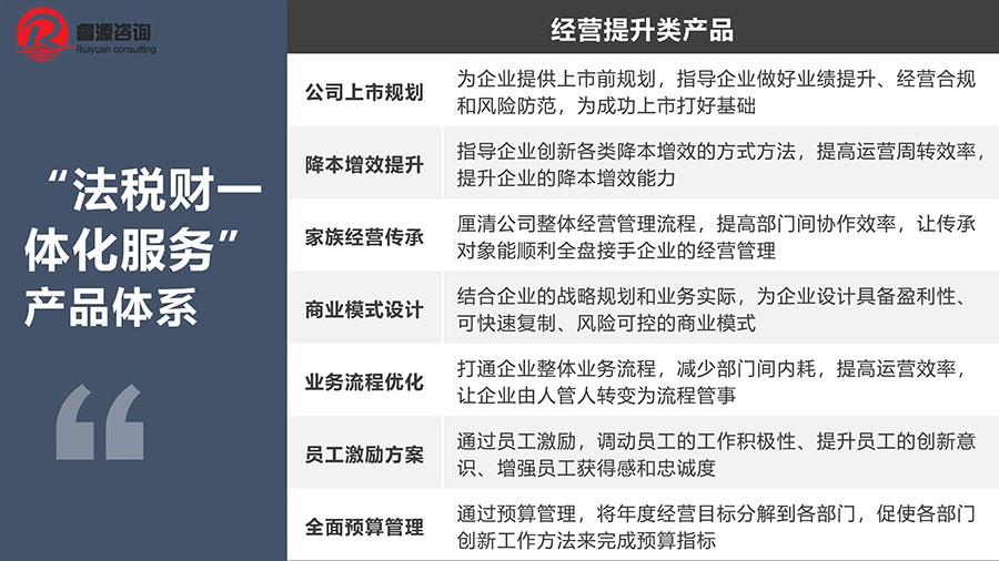 睿源咨询公司以法税财一体化为基础,为企业提供经营提升、风险防控两大类的深度咨询服务。团队成员由律师、税务师、注册会计师、企业高管组成,打破专业壁垒。为客户提供省心高效的综合服务,客户只需对接公司一个团队,即可实现在优化商业模式的同时,提升企业运营效率,在合规经营的基础上全面防控法律、税务、财务方面的风险。