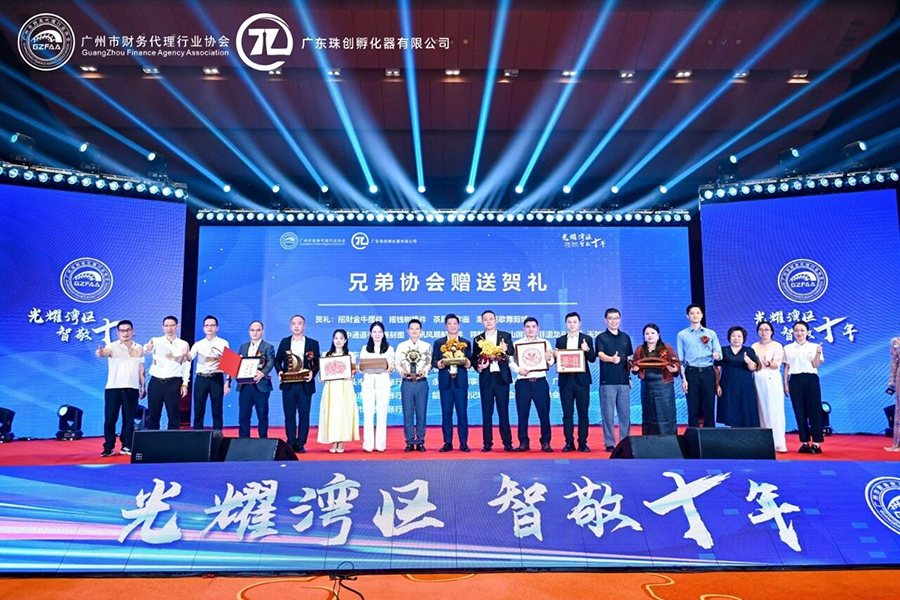 此次庆典以“光耀湾区、智敬十年”为主题,隆重汇聚政府部门、行业机构及企业界的众多精英与代表。佛山市代理记账行业协会理事兼政务服务专委会主任李雄杰(诚慧盈财税)、理事麦珍(天宇华侨)、韩玉晖(严正财务)、理事代表晓丹(会帮手企管)、及秘书长区芝凝受邀出席,到场共贺该次行业盛典。庆典现场,近700位嘉宾齐聚一堂,高朋满座、气氛热烈。