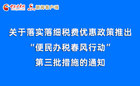 Apr/04 2023关于落实落细税费优惠政策推出“便民办税春风行动”第三批措施的通知为深入学习贯彻党的二十大精神,认真落实中央经济工作会议、全国两会和国务院常务会议部署,不折不扣执行延续和优化的税费优惠政策,税务总局推出“便民办税春风行动”第三批20条措施,确保各项税费政策及时落实落细、落准落稳,提振市场信心,稳定市场预期,推动经济运行持续整体好转,积极助力高质量发展。现通知如下: